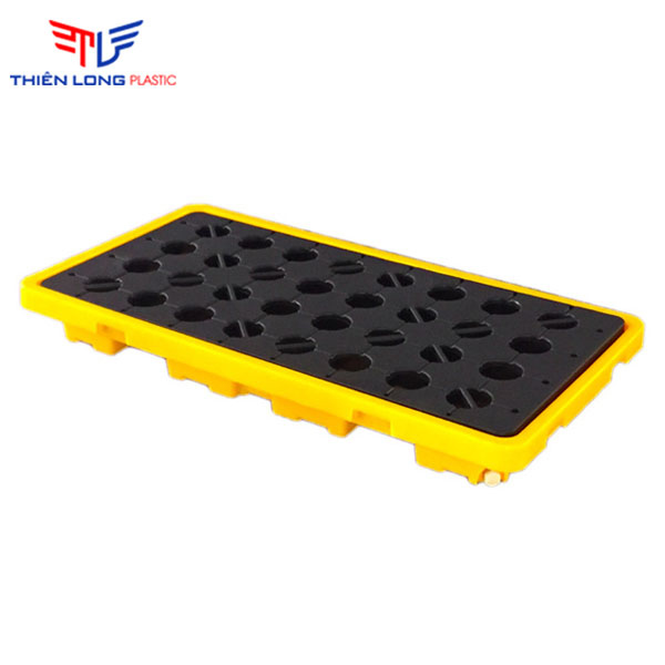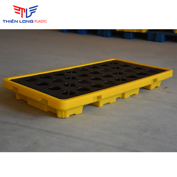 - Pallet nhựa chống tràn 2 phuy với thiết kế có rãnh thoát nước được làm từ 100% HDPE nguyên sinh (màu vàng) chịu được cường độ cao bằng công nghệ sản xuất ép phun. Tương thích với nhiều loại hóa chất, bao gồm cả axit và chất ăn mòn…